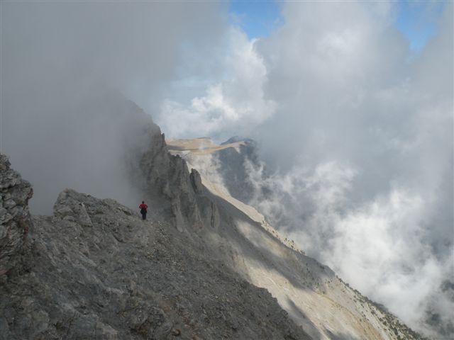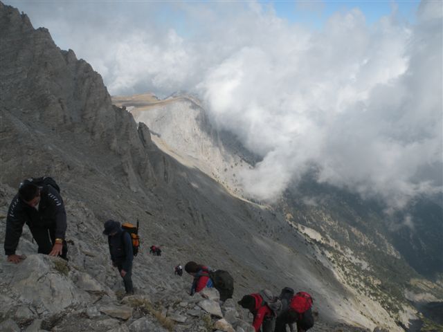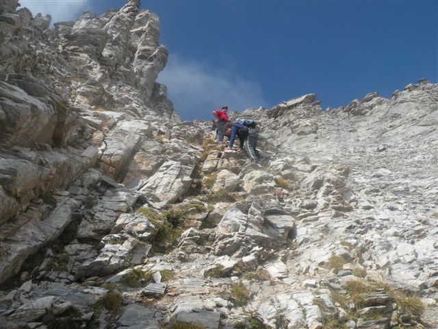 Sa prestankom rada generatora odlazimo na spavanje. Sutradan smo svi na nogama u zakazano vreme. Krenuli smo u cik zore. Neki još sanjivi teturaju se u koloni. Prva pauza je na raskrsnici staze. Prva grupa kreće normalnim putem ka Skali i Mitikasu, a druga ka Stefaniju i Mitikasu.Veća prva grupa je veoma brzo izašla na Skalu(2866m) i nastavila oprezno ka Mitikasu. Nakon silaska sa Skale nekih stotinak metara nastavlja se uspon ka vrhu. Na puto do vrha su osigurani neki detalja sajlama što je ohrabrilo neiskusne planinare. Na Mitikasu(2918m) magla i vetar. Povremeno vetar rastera maglu pa se pojave stravični vidici. Možda je magla i saveznik početnicima. U isto vreme kad je prva grupa bila na Mitikasu druga grupa je bila na Stefaniju(2909m). |