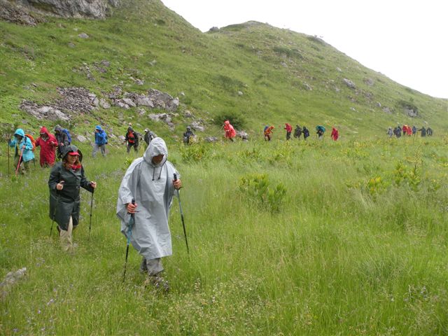 na prevoj pa preko livada izlazimo na strmi greben. Magla nam sužava