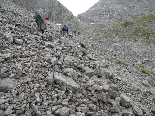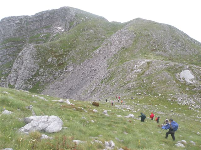Zastajemo pored jedne stene gde se nalazi spomen ploča nastradalim planinarkama članicama AO iz Beograda. Oblačimo kišne kabanice i nastavljamo dalje ka prevoju između Štitana i Surdupa. Jedan deo grupe odustaje od uspona. | ||