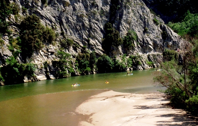 Odozgo se ne vide svi meandri reke Neste već samo poslednja tri. Zatim smo se vratili u izlazni deo klisure i prošetali stazom uklesanom u stene oko kilometar uzvodno. Staza se nalazi iznad reke i pruge sa dosta tunela. |