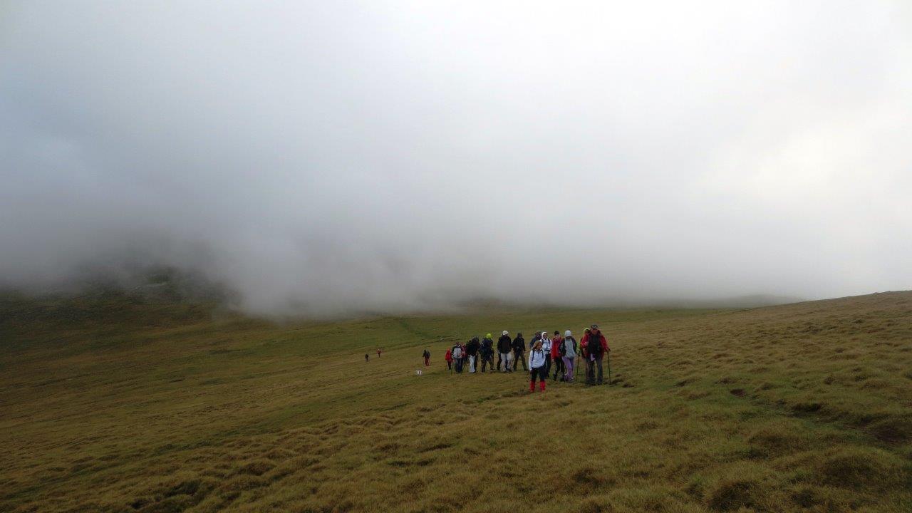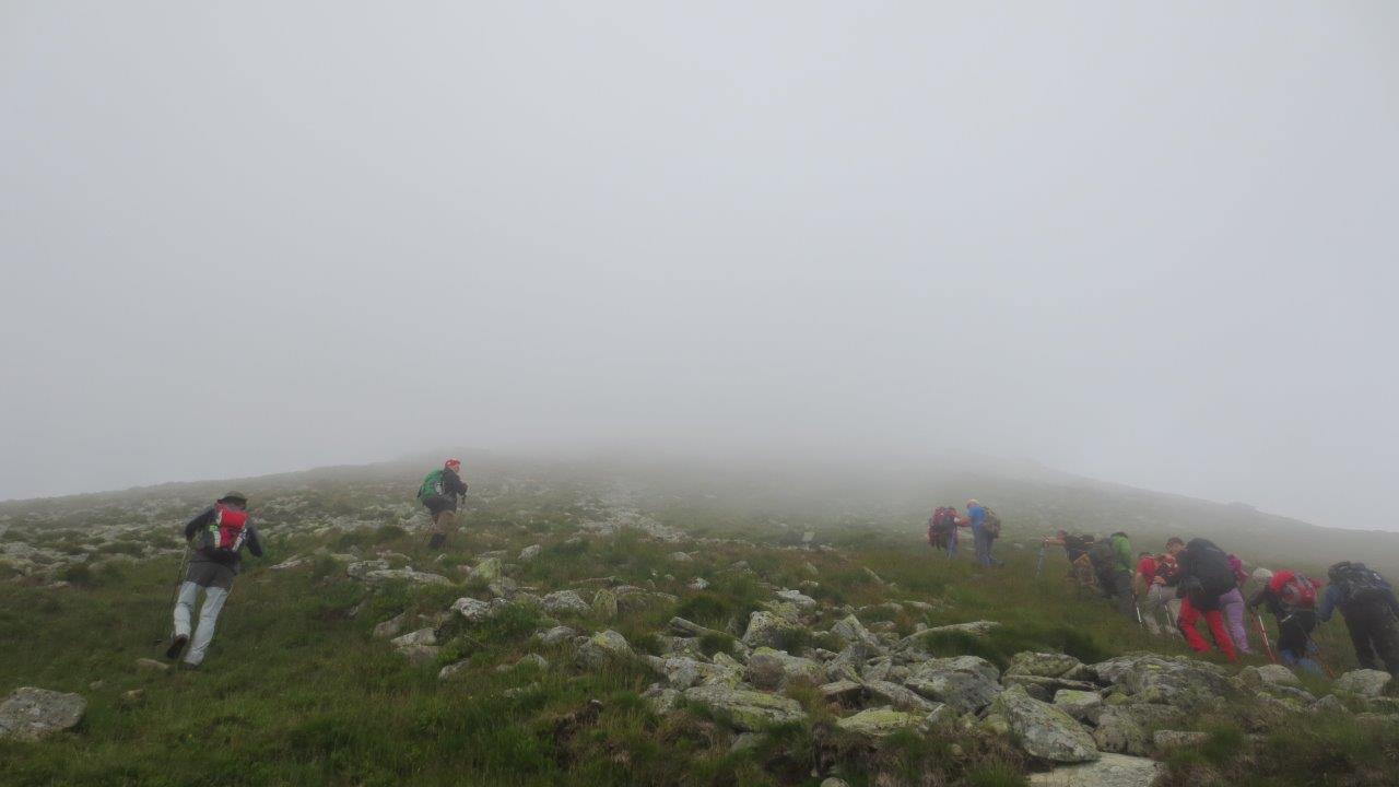 Vidljivost je bila smanjena, ali, uz pojačanu opreznost da se mnogo ne razdvajamo, nije bilo mnogo problema tokom hodanja. Zaobišli smo vrh Papuša sa jugozapadne strane i uputili se ka obližnjem vrhu Galbenul (2137 m), gde smo izašli u pola jedan. Kako smo imali puno vremena, polegali smo na ovaj prostrani, zaravnjeni, travnati vrh i odmarali. Povremeno su se oblaci podizali i na trenutak otvarali poglede na planinske masive, svuda oko nas, no, takvo vreme, kao i uvek, nije nam smetalo. Naprotiv, bilo je nam je lepo i prijatno. Lagano smo nastavili dalje, i, nismo ni trepnuli, a već smo bili na Papuši (2136 m). Posle kraćeg zadržavanja i na tom vrhu, spustili smo se malo strmijom stazom, sa druge strane, i presecajući krivine Transalpine, vratili se u Ranku.