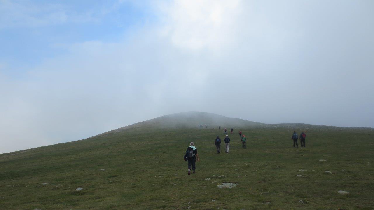 Još samo malo uspona i negde oko 13 sati i posle pređenih 14 kilometara, popeli smo se na Parangul Mare (2519 m). Tokom pauze na vrhu, nažalost, pogleda nije bilo, jer smo bili potpuno obavijeni maglom, ali, nije smetalo. Bili smo prezadovoljni, srećni zbog uspona na najviši vrh masiva, oduševljeni prirodom oko nas, pa nam je čak i ta smena vremenskih prilika odgovarala, jer nam nije bilo preterano toplo, što je uveliko olakšavalo pešačenje, kao i konstantne naizmenične uspone i spuštanja. |