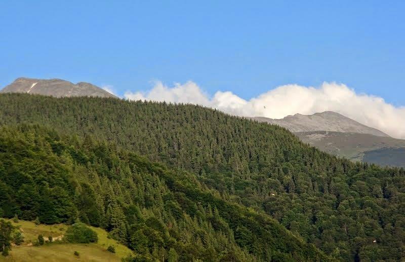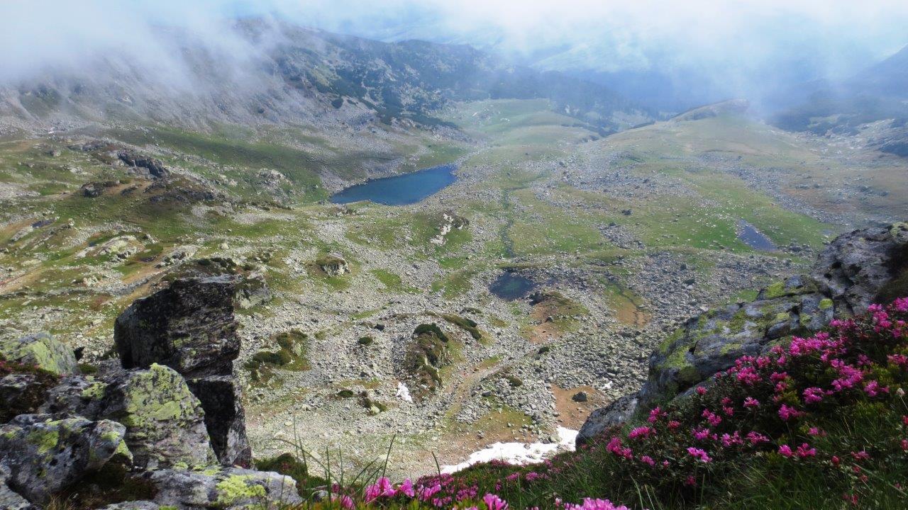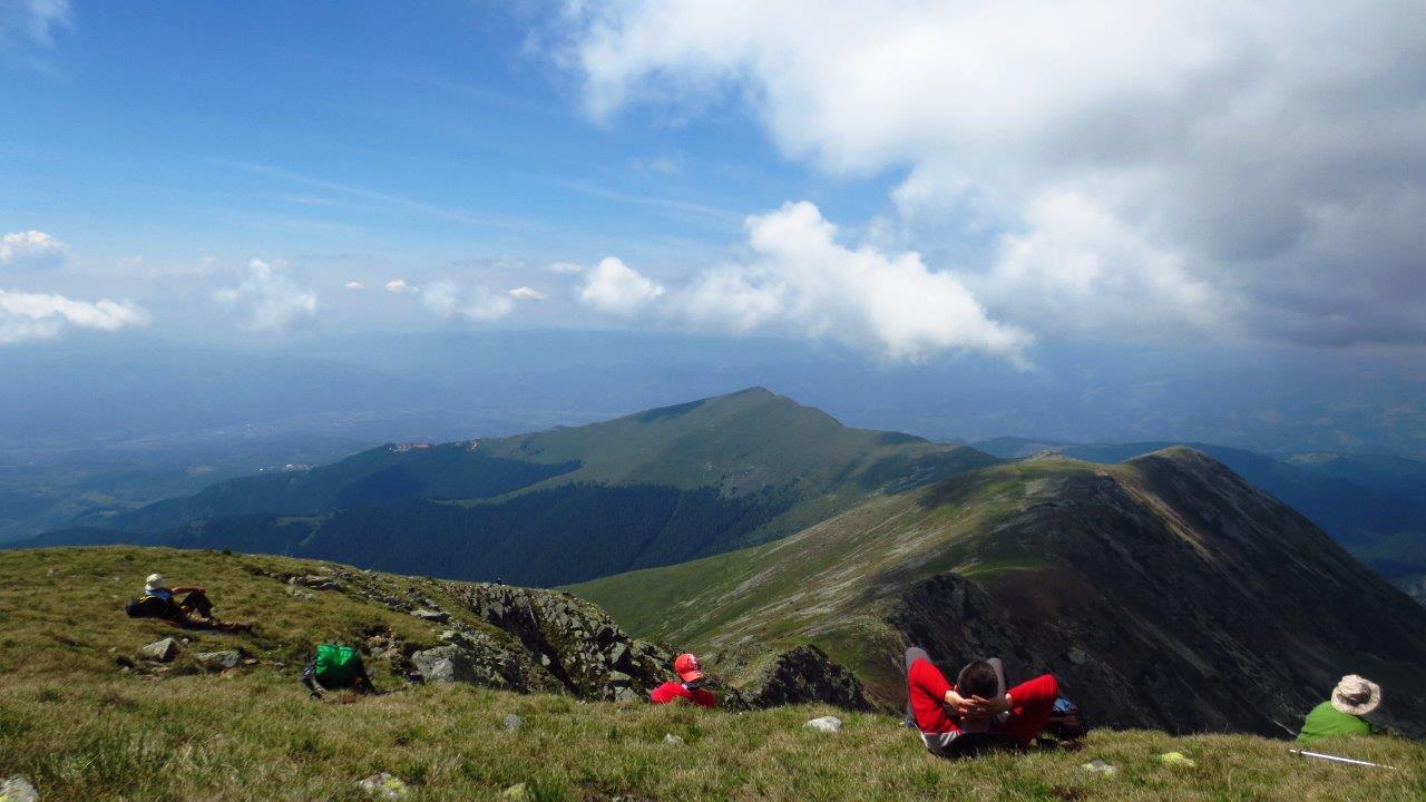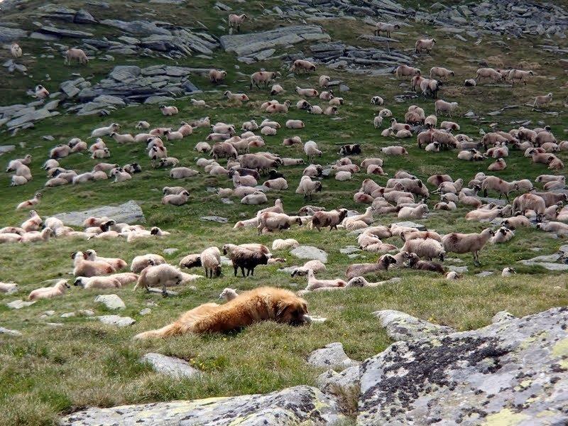 Prešli smo preko vrha Lezer (2137 m), a onda i preko vrha Setea Mare (2136 m), gde smo naišli na šestoricu mladih rumunskih planinara koji su se, kako su nam rekli, izgubili i odjednom uopšte nisu više znali gde se nalaze i u kom pravcu treba da idu. Srećom, mi smo se pojavili, pa je Milan otvorio kartu i objasnio im gde su, tako da su mogli mirno da nastave svoj put. I mi smo nastavili dalje… Padine su bile posute nepreglednim bokorima divlje azaleje, potpuno “obojene” njenom prelepom roze bojom. Na jednom stenovitom delu grebena koji gleda na mala jezerca i ove padine, napravili smo pauzu za doručak. Zatim smo krenuli dalje i brzo stigli do prevoja Piatra Taita (“prepolovljen kamen”, na rumunskom – preveo mi je Glocki, planinar iz Požarevca), odakle smo krenuli da se spuštamo nekih 100 metara, a zatim ponovo nastavili lagani uspon. Oblaci su se sve više podizali i uspevali smo da vidimo nastavak masiva ispred nas, koji nas je čekao. A onda su usledili još lepši prizori živopisnih stada ovaca koje su spokojno pasle i odmarale na planinskim padinama, dok su ih požrtvovano i verno čuvali mali, beli psići, “ljutito” lajući na nas, kao i dremljivi šarplaninac, potpuno nezainteresovan za događanja oko njega, dok su i čobani takođe dremali na travi i krajičkom oka nas posmatrali iz daljine. |