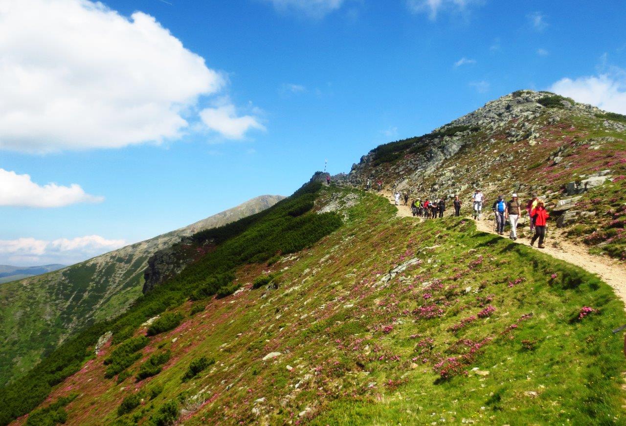 Vrlo brzo, popeli smo se i na njega i opet neko vreme odmarali, ležeći na travi, gledajući u daljini naš cilj, ski-centar Parang, iznad koga se velelepno uzdizao još jedan vrh – Parangul Mic. Kako smo već dugo hodali, nekoliko planinara se i umorilo, pa opet nismo mnogo žurili i često smo pravili pauze. Tako smo imali bezbroj trenutaka za potpuno opuštanje i prepuštanje toj božanstvenoj prirodi. A zatim je usledio nastavak puta, idiličnom stazom, posutom roze azalejama… Iako već umorni, bili smo potpuno očarani prizorima… |