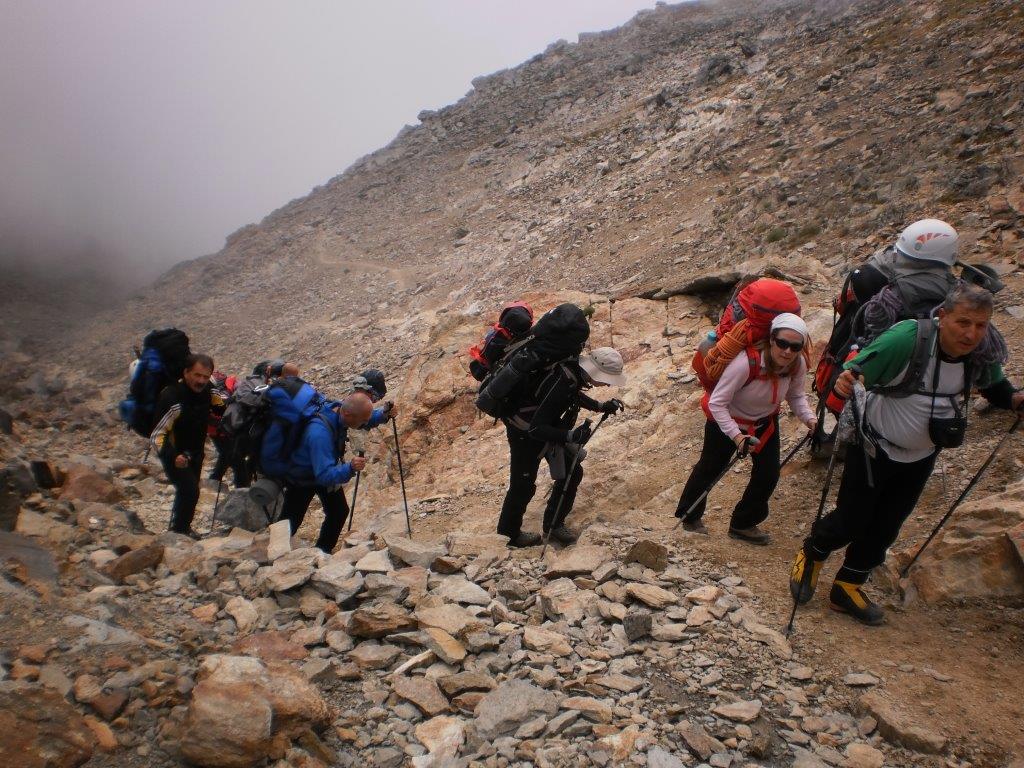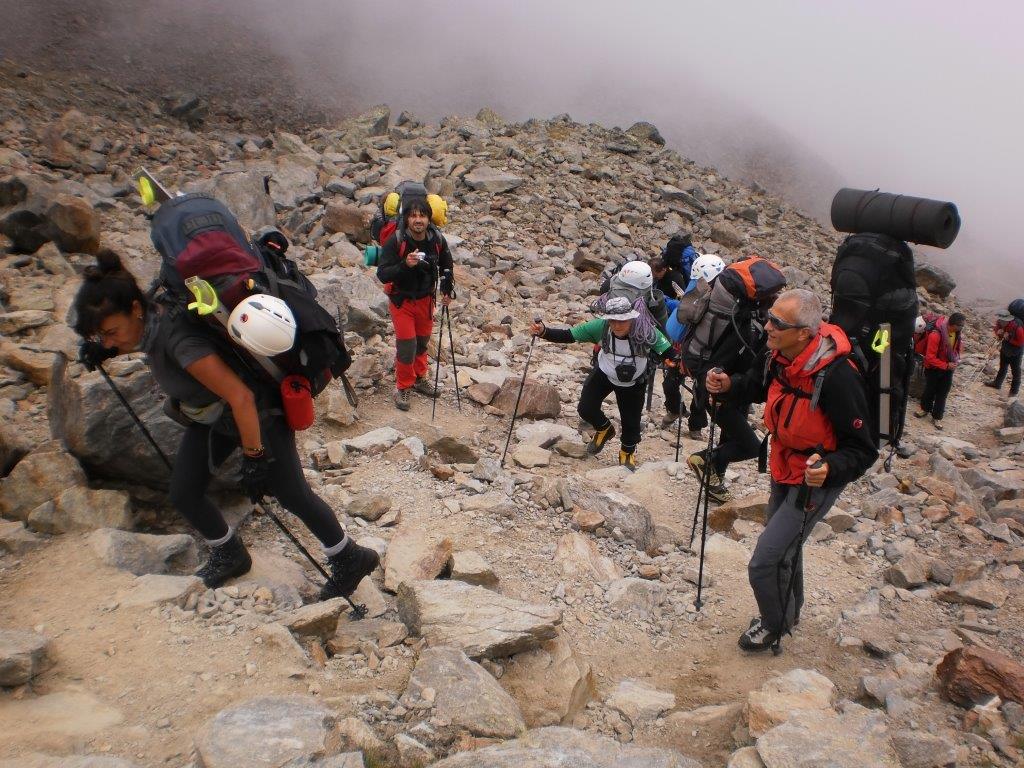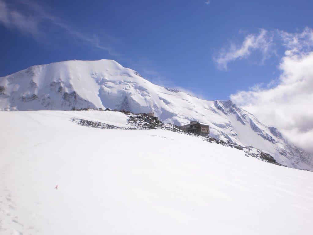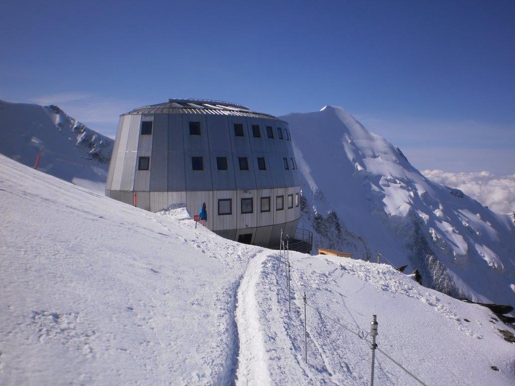 Ustajemo u 06h i pripremamo se za uspon. Sat kasnije krećemo naviše. S obzirom da je deonica pred nama zasnežena, krećemo sa namontiranim derezema. Nakon pola sata uspona stižemo do Velikog kuloara, poznatog po čestim kamenim lavinama. Zahvaljujući snegu kojim je ispunjen i niskoj temperaturi, prelazimo ga svi bez problema. Uspon nastavljamo strmom razuđenom stenom, osiguranom čeličnim sajlama na težim deonicama. Nakon malo manje od četiri sata uspona, izlazimo na terasu starog doma, koji je sada zatvoren. Snežnim grebenom nastavljamo još 200 metara do novog doma. Oko 11h smo svi u njemu. Proveravamo vremensku prognozu za sutrašnji dan, u toku koga treba da izvršimo uspon na vrh i da se spustimo do planinarskog doma Tete Rousse (3167 m). Po prognozi, sutra popodne se očekuje nevreme sa snegom i snažnim vetrom.