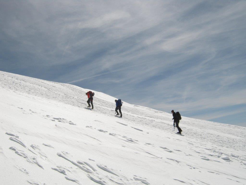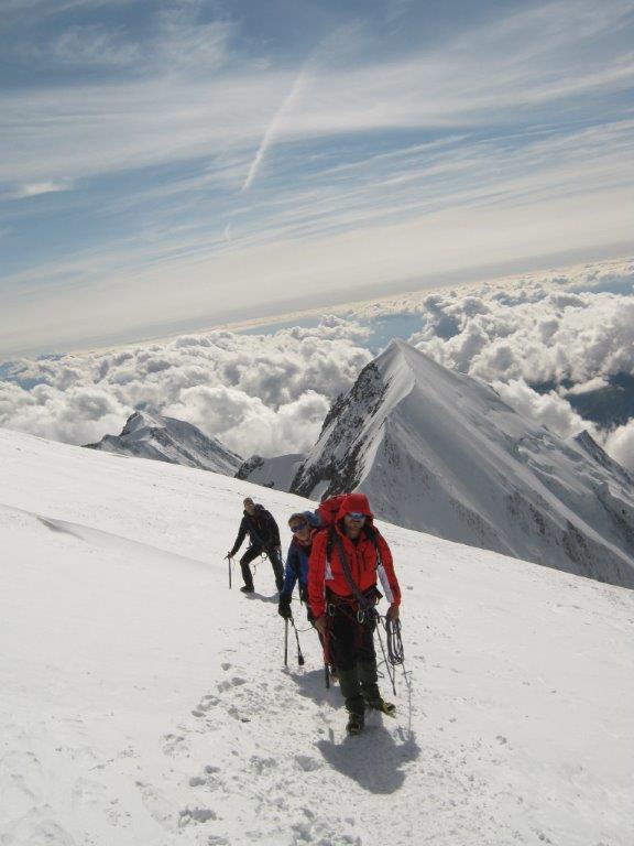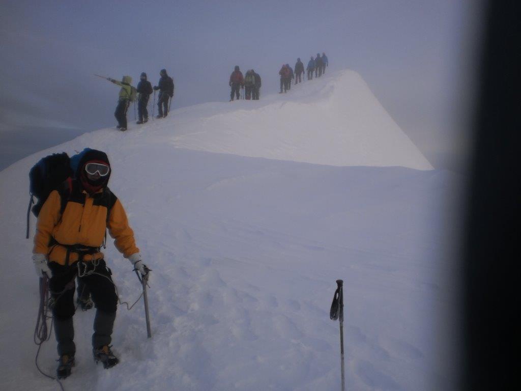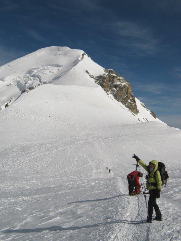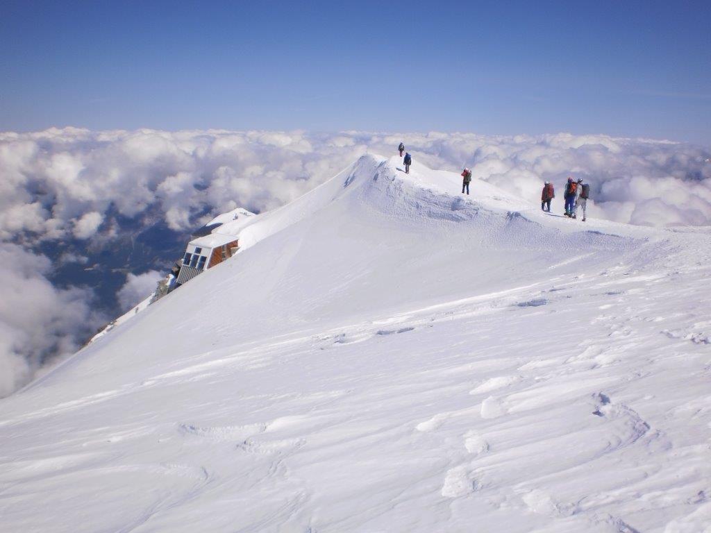 Ustajemo u 0130 i spremamo se za uspon. U 0215 nas šestoro kreće ka vrhu, praveći česte, kratke pauze. Noć je hladna i vedra. Napredujemo dosta dobro i u pet sati ujutru, prekriveni injem, ulazimo u sklonište Vallot, u kome nas čeka šest naših planinara koji su juče popodne stigli u sklonište. Sat vremena kasnije, svi zajedno, u četiri tročlane naveze, krećemo na vrh. Svanulo je i na planinu počinju da se navlače tanki oblaci. Uspon grebenom Mon Blana je naporan, eksponiran i zahteva maksimalnu pažnju, tako da pravimo kratke pauze na svakih 20-30 koraka. Prelazimo pažljivo i poslednju eksponiranu deonicu, takozvani „nož“ i u 0845 stižemo na vrh.