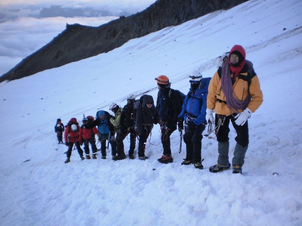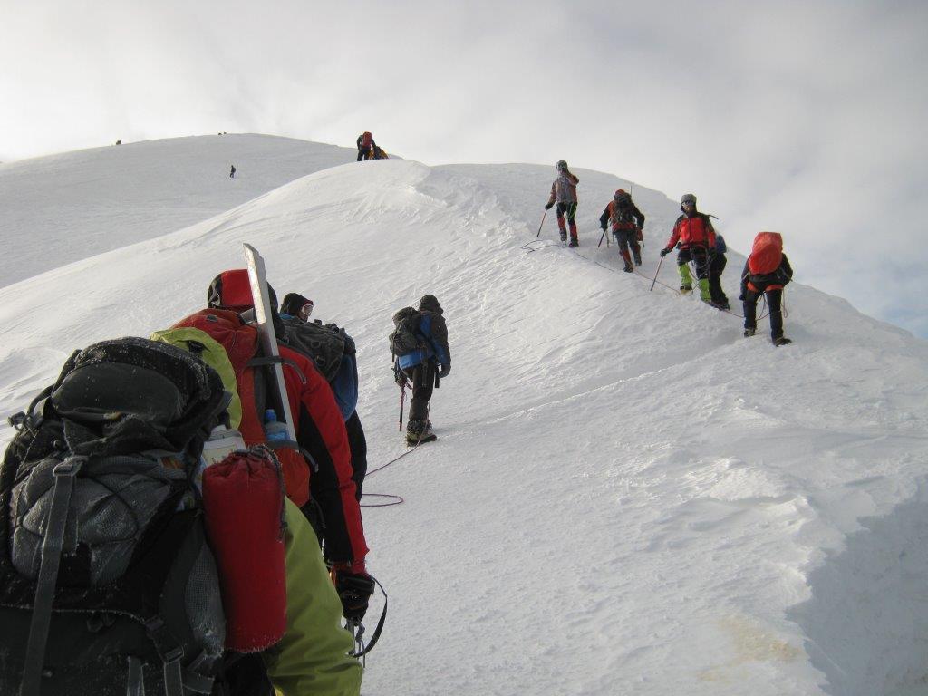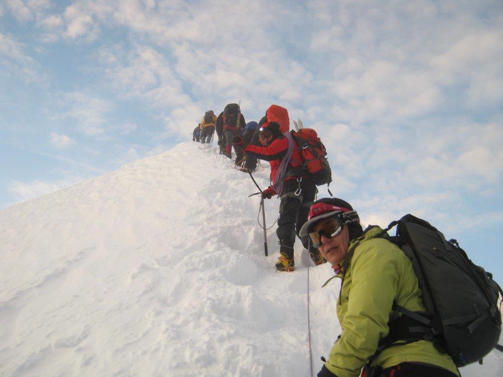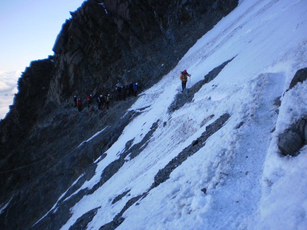 Ustajemo u 0130 i spremamo se za uspon. U 0215 nas šestoro kreće ka vrhu, praveći česte, kratke pauze. Noć je hladna i vedra. Napredujemo dosta dobro i u pet sati ujutru, prekriveni injem, ulazimo u sklonište Vallot, u kome nas čeka šest naših planinara koji su juče popodne stigli u sklonište. Sat vremena kasnije, svi zajedno, u četiri tročlane naveze, krećemo na vrh. Svanulo je i na planinu počinju da se navlače tanki oblaci. Uspon grebenom Mon Blana je naporan, eksponiran i zahteva maksimalnu pažnju, tako da pravimo kratke pauze na svakih 20-30 koraka. Prelazimo pažljivo i poslednju eksponiranu deonicu, takozvani „nož“ i u 0845 stižemo na vrh.