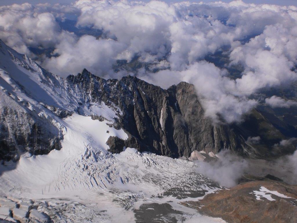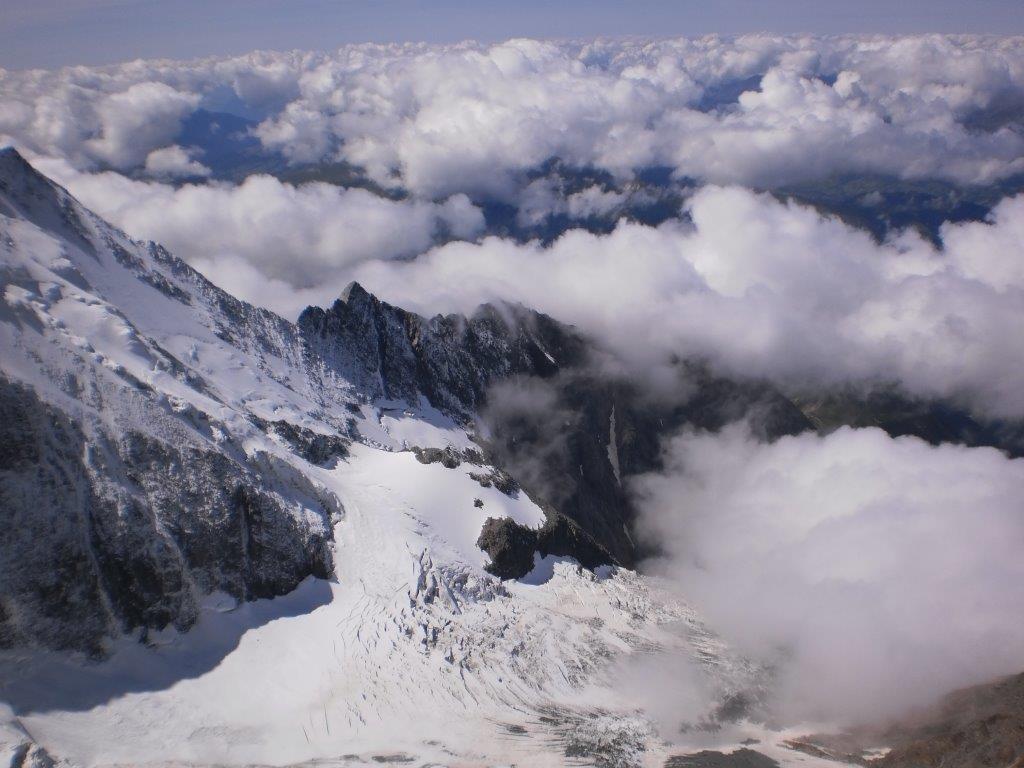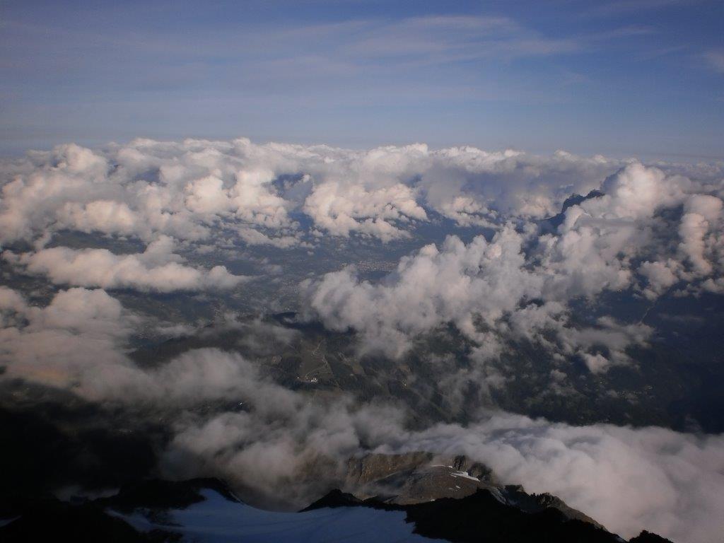 Vreme je sve lošije. Čestitke, fotografisanje i nakon 10 minuta krećemo nazad. Ubrzo, oko 0920, oblaci nas potpuno prekrivaju, vidljivost se smanjuje na nekoliko metara, a vetar pojačava. Spuštamo se pažljivo grebenom i u 1020 stižemo do skloništa Vallot. Vreme je sada veoma loše, pada sneg nošen jakim vetrom, koji za nekoliko minuta briše sve tragove. Dok šest naših planinara koji su prespavali u skloništu pakuje vreće za spavanje, Vlada i ja razmatramo opcije silaska ili čekanja u skloništu da se vreme popravi. Zahvaljujući GPS-u kojim smo snimili rutu našeg uspona, odlučujemo da nastavimo silazak. Iako je Vladi ovo bio peti uspešan uspon na Mon Blan, a meni drugi, naše poznavanje planine u ovakvim vremenskim uslovima nema velikog značaja na donošenje odluke. I pored toga što mislim da bi i bez GPS-a uspeli da siđemo, sigurno je da se bez njega ne bismo usudili da krenemo nizbrdo.