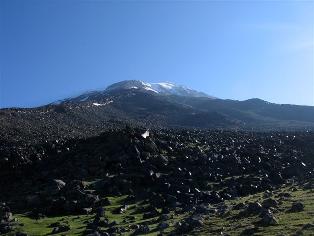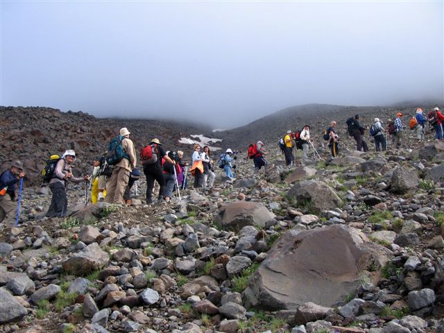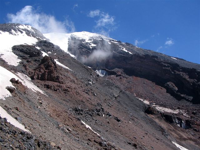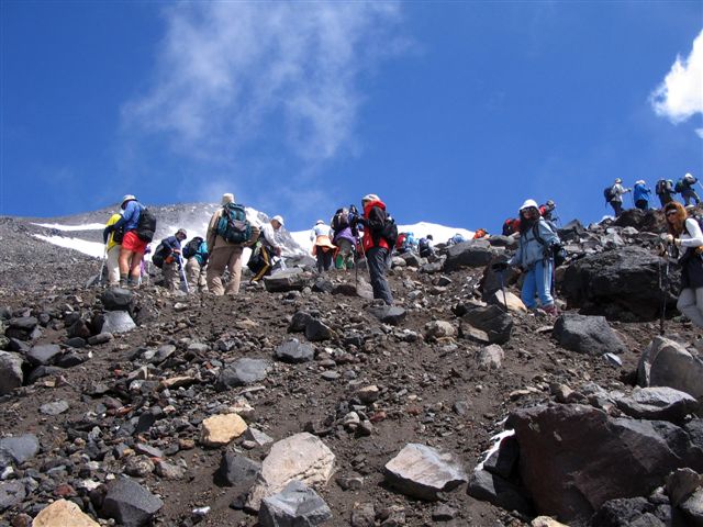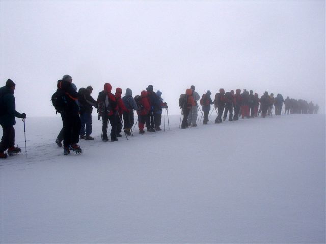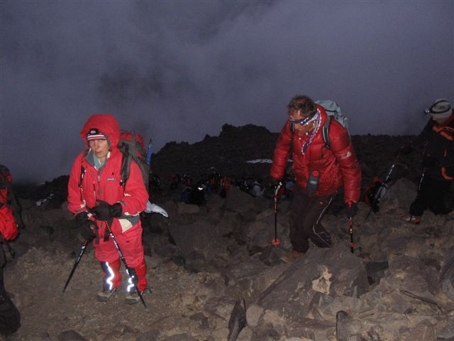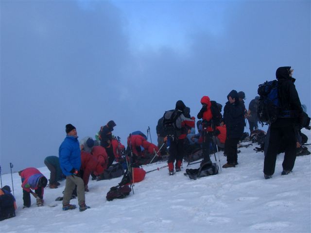 Staza, normalno nemarkirana, po mraku se jedva naslućuje. Provlačimo se iѕmeđu zaleđenih snežišta. Na oko 5000 m zastajemo. Više nema provlačenja. Stavljamo dereze, to je malo potrajalo, i ponovo u kolonu. Odustaju nam dve planinarke i dva planinara. Magla nas obavija. Izlazimo na snežni plato. Polako se krećemo i stigli smo. Nismo očekivali da tako brzo stignemo na vrh.
