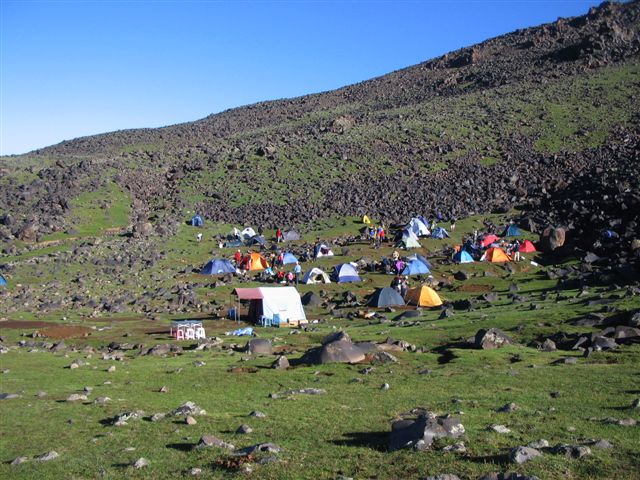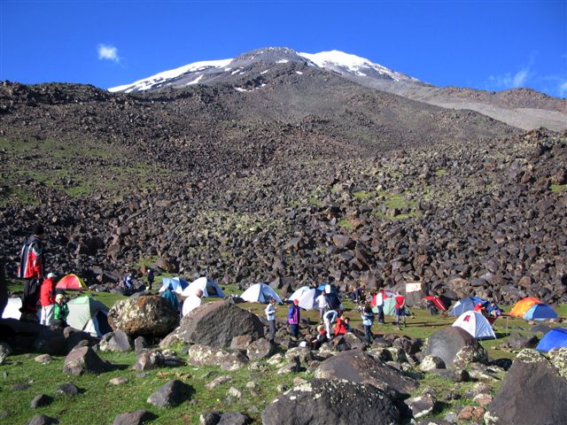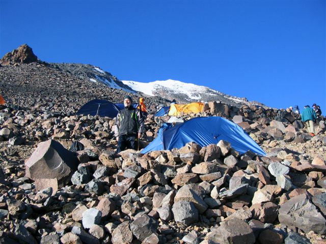 Kiša je kratko trajala. Nastavljamo ka baznom kampu. Popodne smo stigli u bazni kamp. Stigle su i mule sa stvarima. Raspremamo šatore na mesta koja su nam naši vodiči odredili. Pogled ne skidamo sa zasnežene kupe. Samo polako i strpljivo. Neka nas vreme posluži. Noć je bila prijatna.