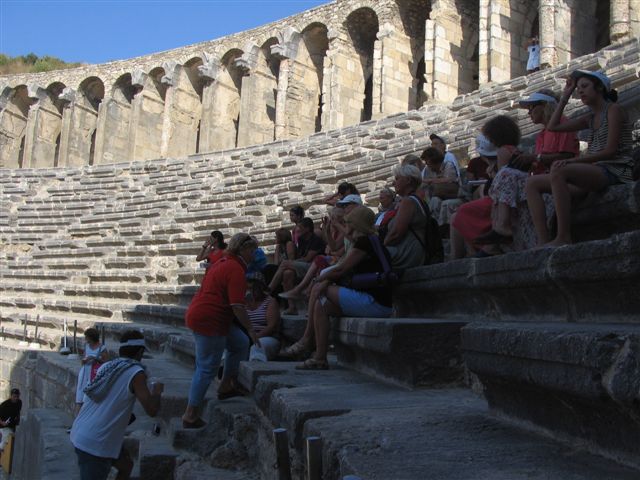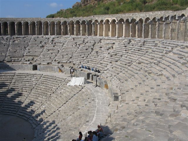Pozorište predstavlja izuzetno dostignuće rimske arhitekture. Sagradio ga je arhitekta Zenon u vreme vladavine Marka Аurelija u 2 v. Iznad pozornice se mogu videti natpisi na grčkom i latinskom da ovo zdanje braća Krispinus i Аuspikatus posvećuju „bogovima zemlje i carskoj porodici“. Spoljašnji zid pozornice se uzdiže u originalnoj visini. Ima prozore u četiri reda, i pet ulaza. Na vrhu zidova se i danas vide mesta za jarbole, nosače za velum - platno koje je štitilo gledaoce od sunca. Sa unutrašnje strane, zid je bio ukrašen sa oko 40 stubova u jonskom i korintskom stilu, dok je mešanje stilova za Grke bilo nezamislivo. Između stubova su bile niše sa skulpturama, a u centru je bila statua boga Dionisa. Nažalost, skulptura i ostalih dekoracija više nema, ali je zgrada pozorišta uz manje izmene sačuvana u obliku u kom je sagrađena. Gledalište ima 40 redova sedišta od mermera. U pozorištu se i dan-danas održavaju festivali i predstave. Zahvaljujući besprekornoj akustici, normalno izgovorena reč na orhestri se savršeno čuje i u poslednjem redu. U to smo se i sami uverili. U 13 v. zgrada pozorišta je pretvorena u letnju rezidenciju Аledina Kajkobada. Na fasadu su tada postavljene pločice od plavog fajansa sa prikazima ptica i cveća, tipične za umetnost Seldzuka.