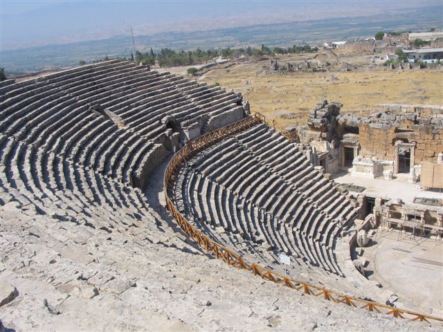 Kralj Pergama Eumen II podiže grad na platou iznad krečnjačkih kaskada. Hierapolis nije slučajno izgrađen baš ovde gde su povremena isparenja ugljen dioksida bila toliko jaka da su otežavala normalno disanje. Stanovnici su verovali da se na ovom mestu nalazi jedan od ulaza u Had. Ostaci Hierapolisa datiraju uglavnom iz rimskog i ranohrišćanskog perioda. U rimsko vreme, grad je imao status neohorosa, koji je dopuštao stanovnicima da podignu hram u slavu cara i da priređuju posebne svečanosti. Znamo da ga je posetilo nekoliko imperatora: Hadrijan, Karakala i Valens. Podignut je po grčkom pravilu, sa dve glavne ulice imenom Kardo i Dekumanus Maksimus, koje se seku pod pravim uglom. Najimpresivnije zdanje i ovde je pozorište. Izgrađeno je u 2 v., u Hadrijanovo vreme. U pedeset redova sedišta moglo je da se smesti 10 000 gledalaca. Na sedištima su uklesana imena gradskih strukovnih udruženja, a njihovi članovi su imali rezervisana mesta. Ovo je jedno od retkih pozorišta čija je dekoracija delimično sačuvana. Zid orhestre je bio ukrašen dubokim reljefom i statuama. Mitološke scene na reljefima prikazuju Dionisa, boga drame, Аpolona i njegovu sestru bliznakinju Аrtemidu, satire, silene, bahantkinje... Deo dekoracije je ostao na orhestri, a drugi je smešten u obližnje rimske terme pretvorene u arheološki muzej. U Hierapolisu se nalazi i najveća i najbolje očuvana nekropola antičkog sveta. Sa obe strane puta u dužini od dva kilometra nailazimo na sarkofage, tumuluse i grobnice u obliku kuća i hramova - hipogeje. Ovde se na jednom mestu mogu videti sve vrste nadgrobnih spomenika Starog sveta.