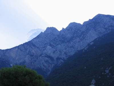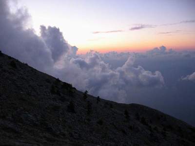Ustajemo u 5.30, spremamo se i bez stvari u polumraku posle šest sati polazimo ka vrhu. Jedan je odustao tako da nas je osmorica. Duva povremeno jak vetar, na zapadu vedro a na istoku i na vrhu promiču i gomilaju se oblaci. Ipak stabilno vreme. Sunce proviruje iznad Male Azije, a na zapadu ogromna senka Atosa u moru. Staza krivuda južnim kamenitim padinama. Pred izlazak na vrh vidimo veliki metalni krst, znači stigli smo. Gore smo stigli oko 7.30. Vetar i povremeno oblaci ali pogled izuzetan.