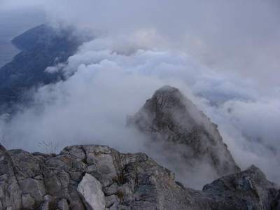 Veći deo istočnog dela Svete Gore ispod nas u oblacima, a zapadna obala vidljiva sa još većim delom Halkidika. Na vrhu Atos - 2033m nalazi se kapela Sv. Preobraženja u kojoj su prespavali dvojica austrijanaca. Pomolismo se Bogu i nazdravismo pa posle pola sata nazad do Panagije.