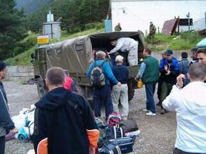 Autobus je došao do kraja puta i ispred nas se ukazala platforma - lift (dužine 50-ak metara) koja je trebalo da nas sa stvarima podigne do terenskih vozila. Putovanje do nastavno-školskog centra Ulu-Tau (2350m) u kamionima trajalo je oko 40 minuta i kad smo stigli, proverili smo, sve kosti su nam, manje-više, bile na mestu.