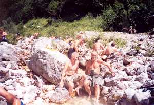 14:30: Stigli smo do potoka koji se spušta niz korito iz pravca luknje. Strmoglav je silazak bio serpentinskom stazom. Kolona se razvukla. Pauzu kod potoka iskoristili smo za kupanje i osveženje. | ||