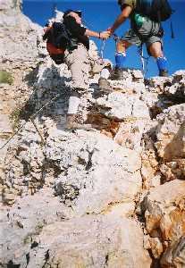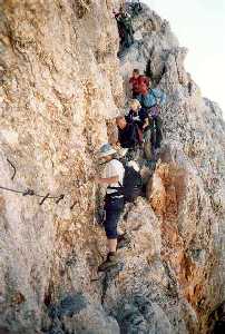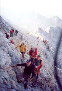 | 09:00: Polazak sa vrha ka Doliču. Dara se iznenada okliznula na steni gde staza naglo menja pravac. Malo je falilo da se otkači niz liticu. Pri padu je nagnječila grudnu kost. Lončar i njemu najbliži reagovali su brzo i pomogli joj da se izvuče. Osigurali su je i pomagali joj pri silasku niz strmoglavu liticu Triglava ka Diliču. Prolazimo raskrsnicu gde se odvaja put ka Planici. Mi nastavljamo desno ka Luknji i Tržaškoj koči na Doliču. |