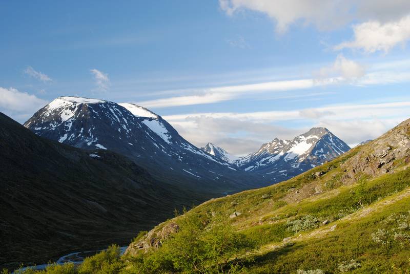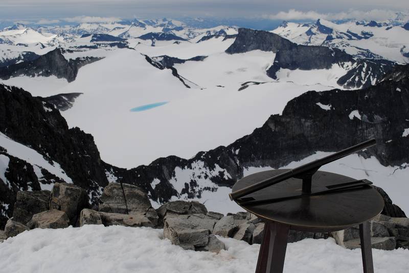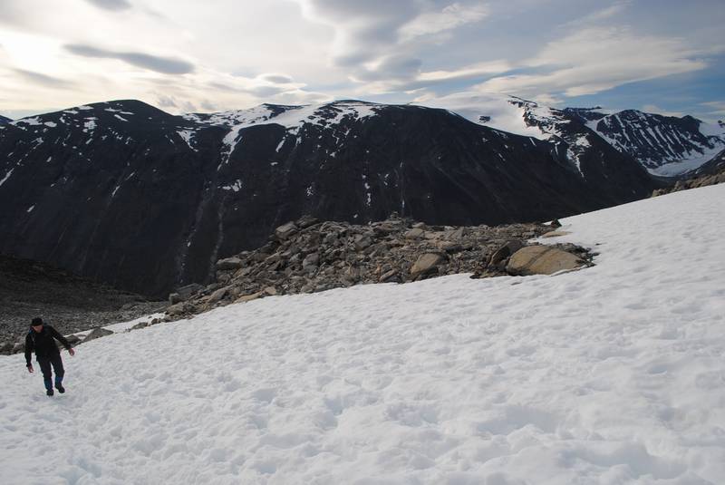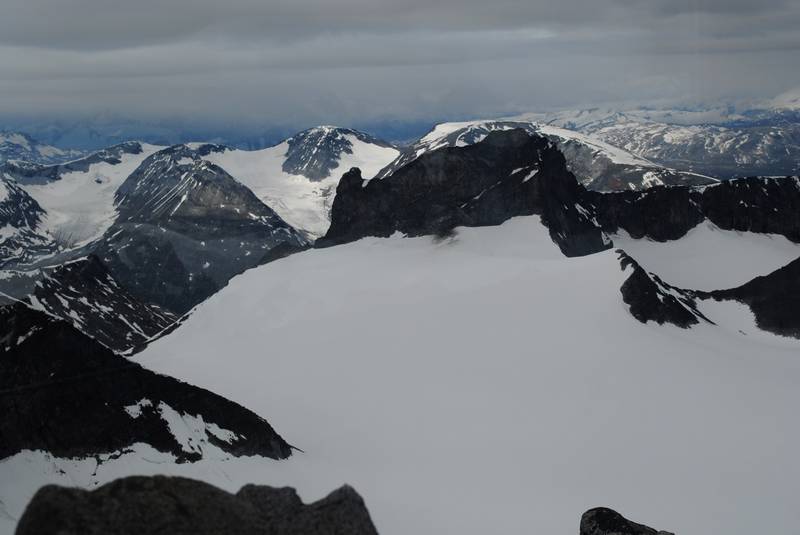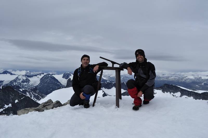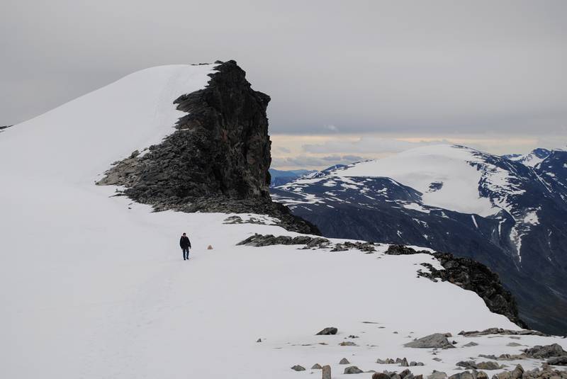 | U Norveškoj je sve pomereno za oko 1000m dole, pa je tako vegetacija nestala još pre logora (na oko 800m visine je granica do koje raste drveće), a letnji sneg srećemo na 1700m. Navlačimo kamašne. U početku su to krpe snega, ali kasnije, moram priznati, uspon postaje zanimljiviji, a sneg je prekrivao sve oko nas. Posle prvog predvrha (za koji smo zapravo smatrali da je glavni vrh) se otvara vidik i na zapadni venac, malo se spuštamo do nekog sedla, a zatim sledi drugi predvrh, sedlo i konačno završni uspon. Ovaj snežni deo je u kombinaciji sa predivnim pogledom definitivno popravio utisak o celokupnom usponu. | |||||