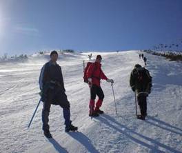Jutro je sunčano i lepo, ispred nas ski staze uredjene kao piste. Laganim hodom penjemo se, uspon je veliki, stavljamo dereze i nastavljamo dalje. Skijaši su već na stazi, sunce nas obasjava svojim zracima, uživamo u lepom danu.