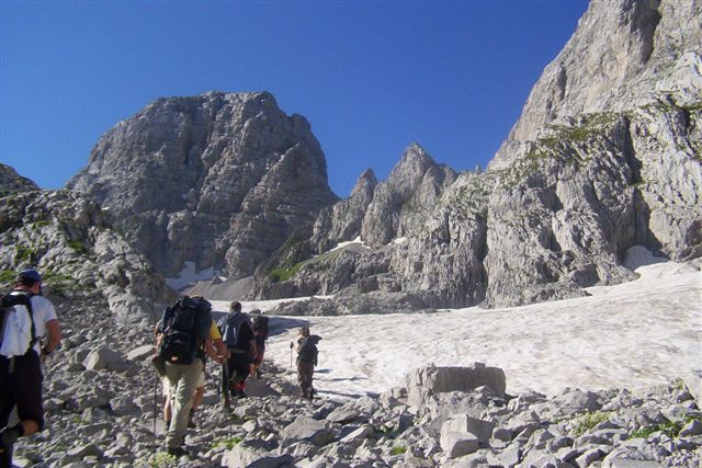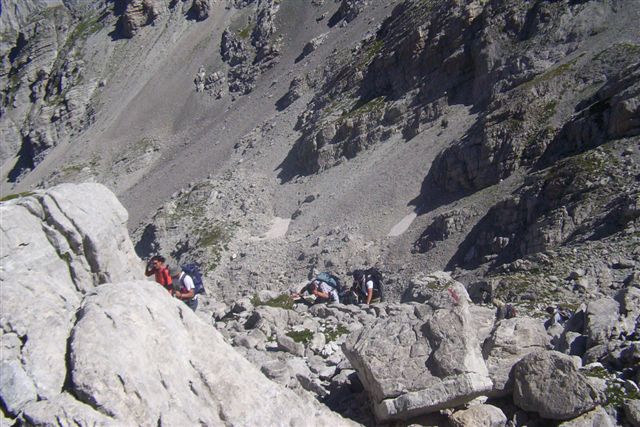 No, to nije bio kraj naše avanture. Usledilo je spuštanje niz strmi i krušljivi kuluar. Postavili smo uže na njegovom gornjem delu i krenuli da silazimo, dvoje po dvoje. Bilo je potrebno puno koncentracije, jer je sipar izmicao ispod naših nogu, stene ostajale u rukama, a kamenje različitih veličina povremeno je preletalo iznad naših glava. Ipak, svi smo bili maksimalno koncentrisani i pažljivi, i posle skoro dva sata, bezbedno smo se spustili do prevoja. Usledio je povratak istim putem.