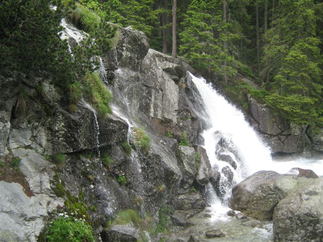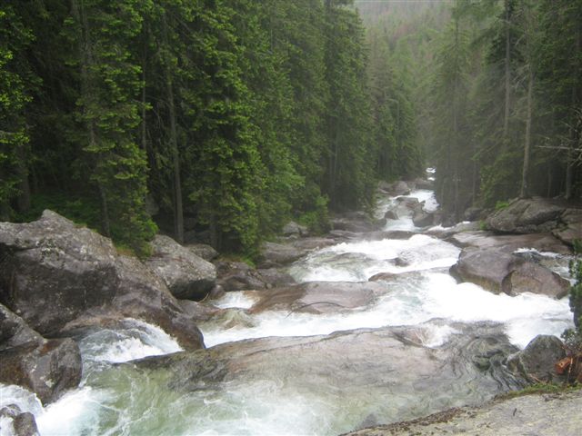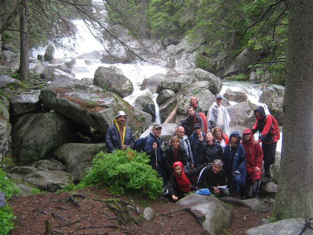 Subotnje jutro osvanulo je tmurno, hladno i kišovito. Nažalost, zbog zaista loših vremenskih uslova, morali smo da odustanemo od naše planirane kružne ture i uspona na Furkotski štit, ali smo se vrlo brzo organizovali, obukli kabanice i ipak krenuli u turistički obilazak slovačkih gradića, a deo grupe i u kraću, planinarsku šetnju. Prvo smo svratili u Poprad, a zatim otišli u Tatransku Lomnicu koja je najveći, najviši i najbolje opremljen ski-centar u Tatrama. Svi ti slovački gradići međusobno su povezani železnicom na električni pogon čija dužina iznosi 35 kilometara. Obilazimo gradić, a zatim autobusom idemo do Tatranske Lesne, odakle deo grupe polazi na pešačenje, a ostali planinari idu autobusom do Starog Smokoveca, gde ćemo se naći kasnije. Od Lesne (930m), krećemo obeleženom i uređenom stazom uz reku Studeni Potok. Kiša sipi, ali ušuškani u široke kabanice, ne marimo mnogo. Huk reke je sve jači i jači, stapa se sa romorenjem kiše, ne čujemo se jedni između drugih. Ali reči tu nisu ni potrebne. Gledam samo ta ozarena lica i na njima vidim divljenje, uzbuđenje, sreću...Penjemo se sve više i više. Bukovi, slapovi, vodopadi...postaju sve veći, brži i uzbudljiviji...Kapljice vode rasprskavaju se na sve strane. |