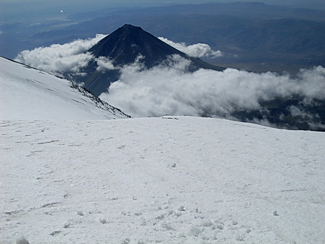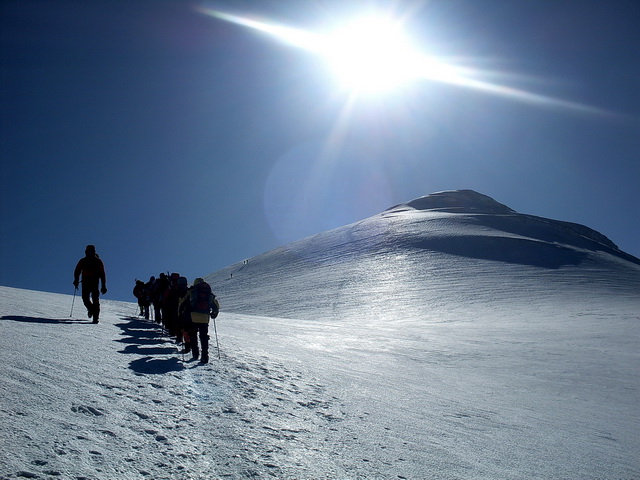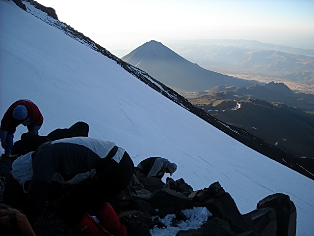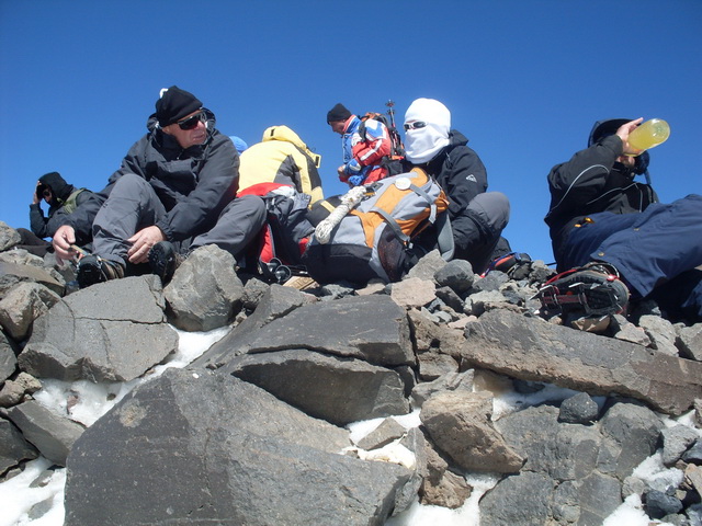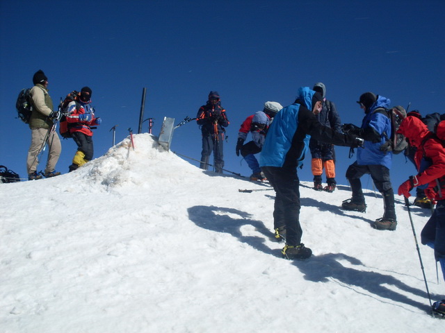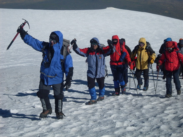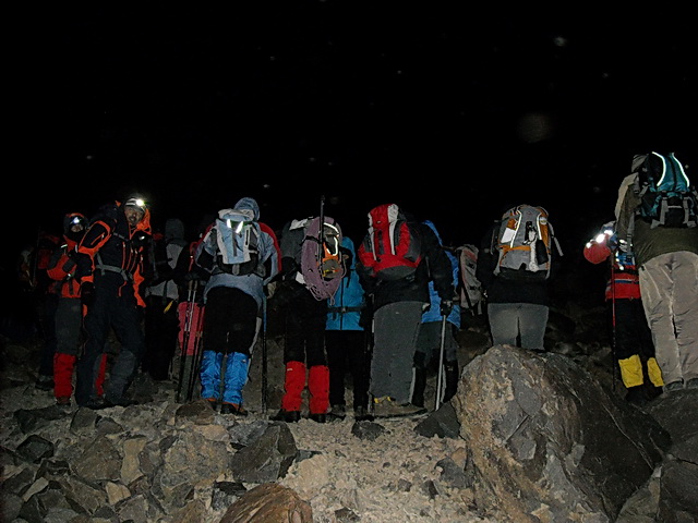 Zavetrina,... pada naredba da stavimo dereze i nešto pojedemo. Oblačim još jedan polar ispod jakne i polako mi se vraća toplota u telo. Nameštam dereze, ali bol u prstima koji nastaje od njihovog zagrevanja mi zaustavlja dah. Moram da sačekam da bol prođe. Na 4900m smo, blizu je vrh...samo da mi se vrate prsti na rukama....Konačno, bol prestade, svi smo sa derezama i kolona ponovo krenu. Više mi nije hladno, polar iz ranca je odradio svoje, zagrejao mi telo, a samim tim mi je ta toplota otkravila smrznute prste. A vetar ne jenjava! |