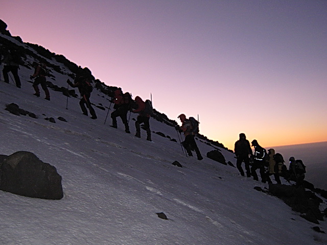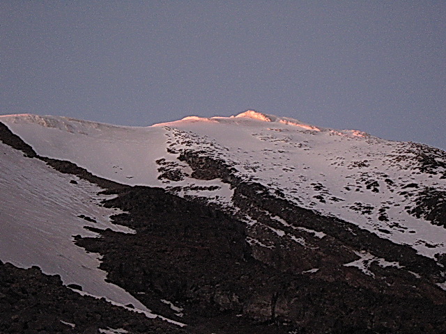 Ne znam o čemu razmišljam dok hodam. Nije mi teško, samo je malo hladno i dosta jak vetar duva. Mrdam prstima i na nogama i na rukama jer znam da mi je to slaba tačka. Penjemo se bez problema, još malo, još malo...svanjava...volim da slikam svanuće, ali sad od toga nema ništa. Ne smem da rizikujem da mi se smrznu prsti. Vetar sve jači, postaje mi sve hladnije, nema više kamenja, sad gazimo sneg. Još uvek ne stavljamo dereze, na grebenu smo , moramo ga preći pa naći neku zavetrinu, vetar je baš zapeo...jedna planinarka odustaje i jedan od dvojice vodiča koji su pošli sa nama se vraća sa njom. Nije mi ništa teško, dobro se osećam,...ali mi je hladno, ...sad baš hladno. |