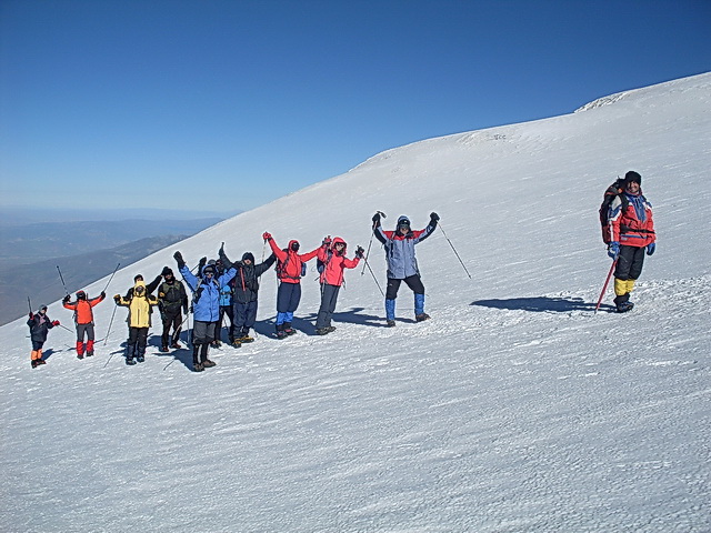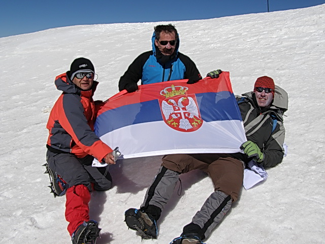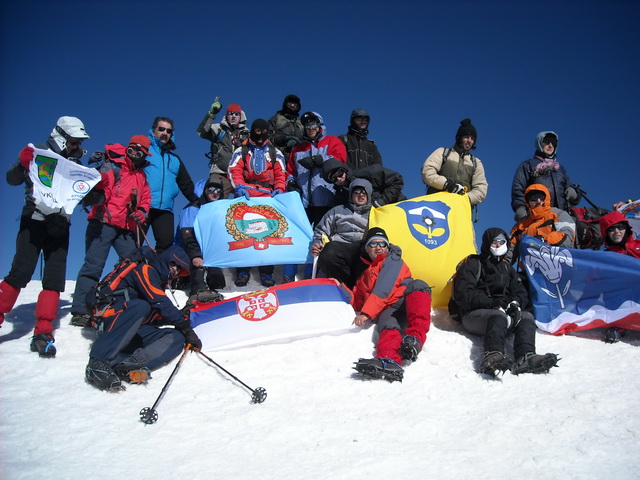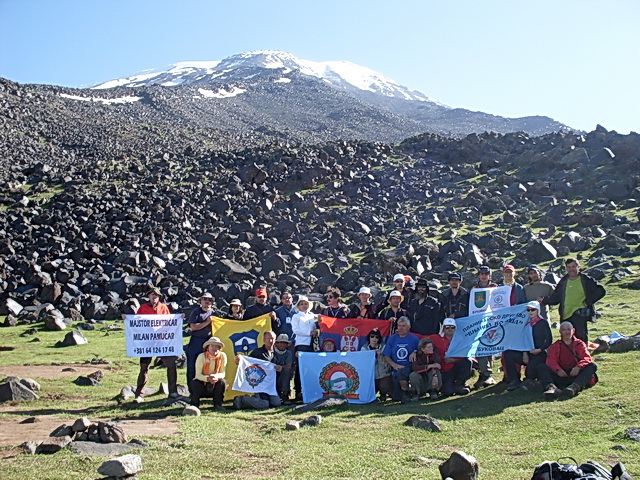 Na vrh smo izašli posle 8 sati. Nas 19, 2 vodiča i dva planinara koji su nam se pridružili u Dogobajazitu. Samo 4 žene. Popeo se i najmlađi Željko i najstariji Slavko.Sam vrh nije atraktivan, ali je pogled fantastičan, mi u snegu i ledu a ispod nas sunce, trava...najlepši je pogled na Mali Ararat. Slikamo se, žurimo, jak je vetar...Gogan vadi majicu Vrbice. |