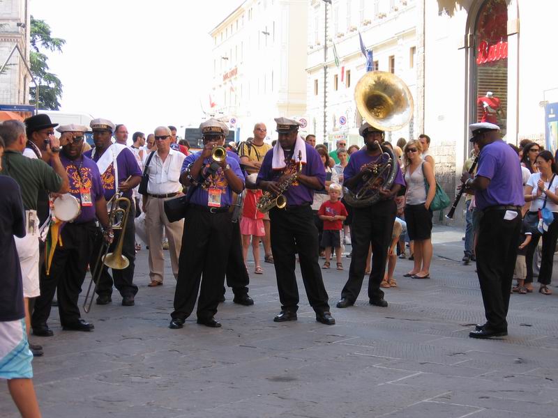 Na moju veliku radost, u toku je svetski poznat „Umbria Jazz“ festival (7-17. jula), tako da su postavljene bine svuda po gradu (priznajem, ona na trgu, kod fontane mi je malčice „kvarila“ kadar za fotografisanje katedrale) i ima baš dosta ljudi na ulicama, što turista, što lokalaca. Imali smo priliku i da prisustvujemo uličnoj paradi, svirao je “The New Wave Brass Band of New Orleans“, a svirka je bila sjajna i zvučno i vizuelno.