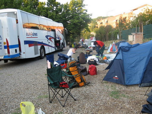 17:35 - stigli smo u okolinu SPOLETA, tražeći kamp „Spello“. Boris je razgovarao sa meštanima neko duže vreme, pošto je bilo diskutabilno, da li će naš autobus (koji je dugačak 13m) moći da stigne do kampa, jer se sam kamp nalazi u brdima, a put je dosta uzak. Ljubazni meštani su odvezli vozača (na žalost samo donekle) svojim kolima da mu pokažu zaobilazni put i da je moguće proći. Krenuli smo. Okolina je vrlo lepa i šumovita i izgleda omiljeno je mesto biciklista.