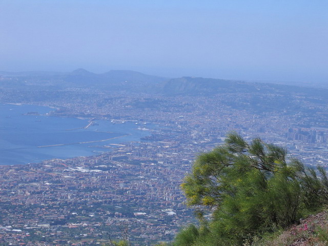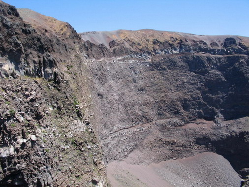 Divno iskustvo! Užasno je vruć dan, ali zbog visine, ovde duva vetar, koji je vrlo prijatan u početku, a što smo bliže krateru postaje oštriji. Prelepo je to što sve vreme dok se uspinjemo imamo pogled na ceo Napulj i napuljski zaliv. Ide se uskom stazicom, koja je ogradjena prema padini. Kada se stigne do kratera, putić vodi oko njega u krug. Svih 39 učesnika se popelo dovde. Boje su fenomenalne. Denis nam je objasnio da su te ružičaste boje koje vidimo - minerali iz zemlje, koje je izbacila lava, a žuto je sumpor... Nisam odolela da sakupim za uspomenu par komadića te ružičaste, stvrdnute mase, iako sam upozorena da se to dosta kruni i da će se vremenom raspasti, ali ko može da odoli da ne ponese i pohvali se ili pokloni komadić toga prijateljima i kaže: „Ovo je sa Vezuva“!...