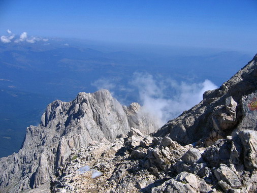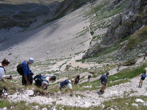 Postigavši visinu od 2450m na prevoju, imali smo pola sata blagog spuštanja do 2330m. Usledio je uspon preko sipara do 2600m. „Ušli smo u stenu“ gde moraju da se koriste i ruke, ali svi su uspešno prošli i u 10:05 uspeli se na najviši vrh GRAN SASSO D’ITALIA - CORNO GRANDE (2914m) - izašlo nas je 23.
