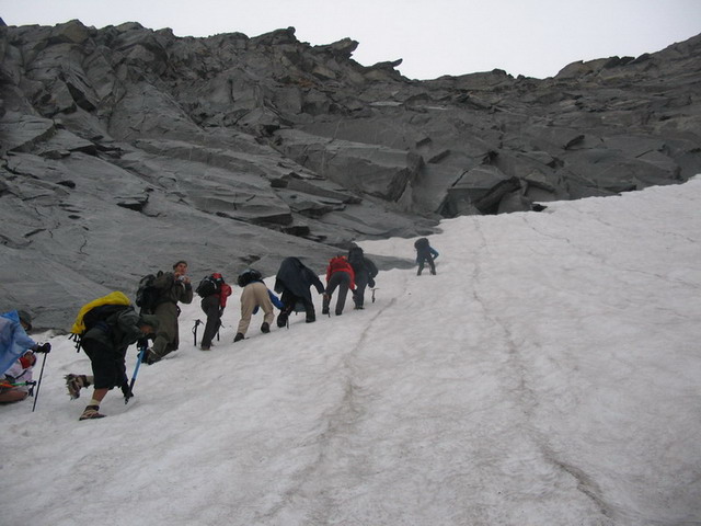 3060m - izlazak na tlo. Uh, kakvo razočaranje kada sam pogledala u svoj visinometar i shvatila da još uvek nismo na vrhu. Čeka nas dugo uspinjanje. Vlada, Ana i ja smo se držali zajedno do vrha i Vlada nas je bodrio i pomagao nam. Sve vreme moraju da se koriste ruke, vreme postaje sve lošije, diže se magla (što možda i nije loše, bar ne moram da gledam pukotine u ledu, mada je dolina prelepa).